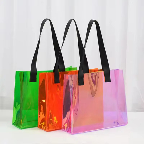 カスタム防水透明ホログラフィックパーティーギフトビーチショルダーショッピングバッグ透明PVCトートバッグ印刷文字パターン付き